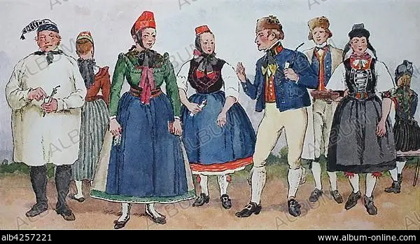 People in traditional costumes, fashion, clothes in Germany, costumes from Hesse, about 19th century, illustration, Germany, Europe.