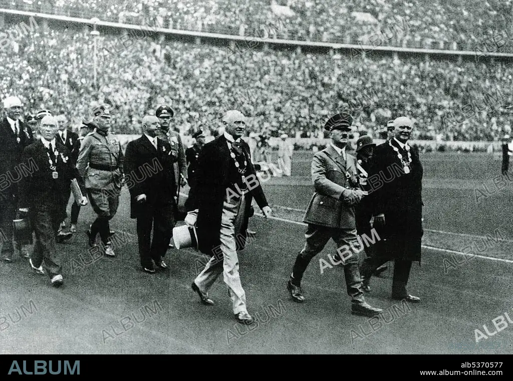 Caption: Olympic games 1936, entrance into the stadium, in the middle Adolf Hitler, right Staatssekretaer a.D. von Lewald, left the president of the Olympic Comitee Baillet-Latur, Berlin, Germany, Europe, historic photo 01.08.1936, Europe