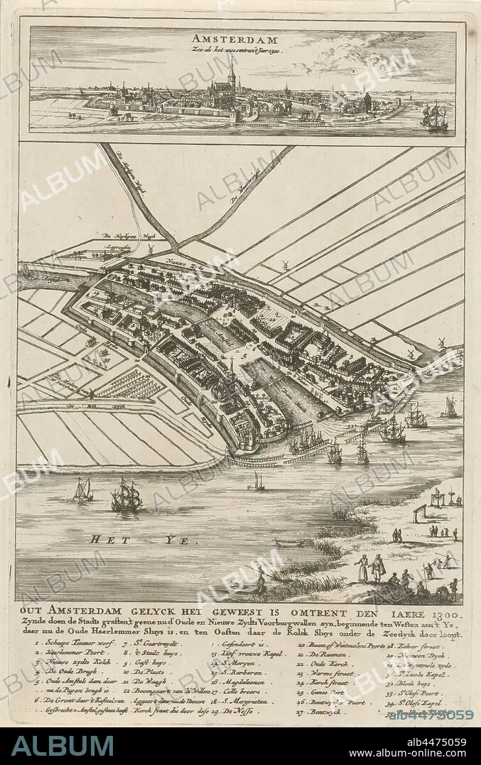 Floor plan of Amsterdam with cityscape, 1300 Out of Amsterdam it was around 1300 / Amsterdam Zoo as it was around Jaer 1300 (title on object), Above a view on Amsterdam, below a map in a bird's eye view. Both represent the city as it would have looked around 1300. Under the title and the legend 1-35, maps of cities, prospect of city, town panorama, silhouette of city, Amsterdam, Jan Luyken (attributed to), 1693 - 1694, paper, engraving, h 286 mm × w 185 mm