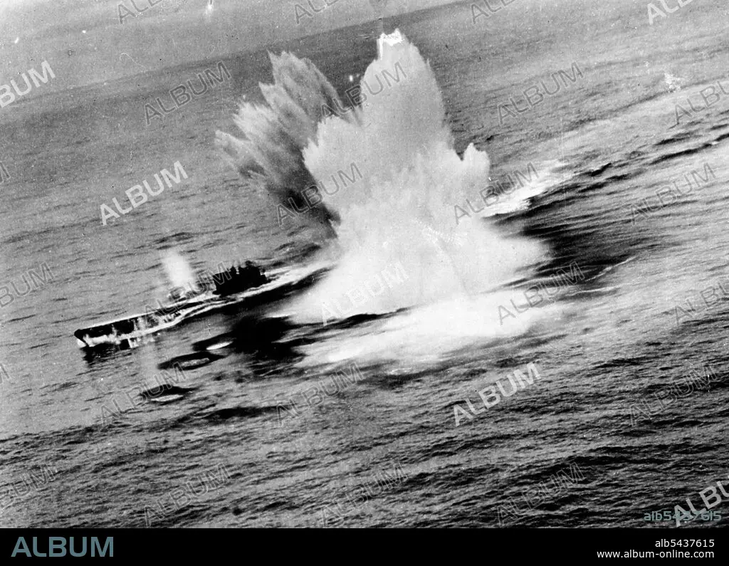 Caption: The first two depth charges dropped explode around the stern of the U-boat while the rear gunner's fire straddles the bows end conning tower. On a patrol in the Atlantic a R.C.A.F. , Sunderland of coastal command sighted a U-boat. The flying boat attacked with machine gun fire and depth charges. In this attack the front gunners fired to such good effect that the German gun crew were almost all killed or wounded and all but one of the U-boat's guns put out of action. Depth charges straddled the
