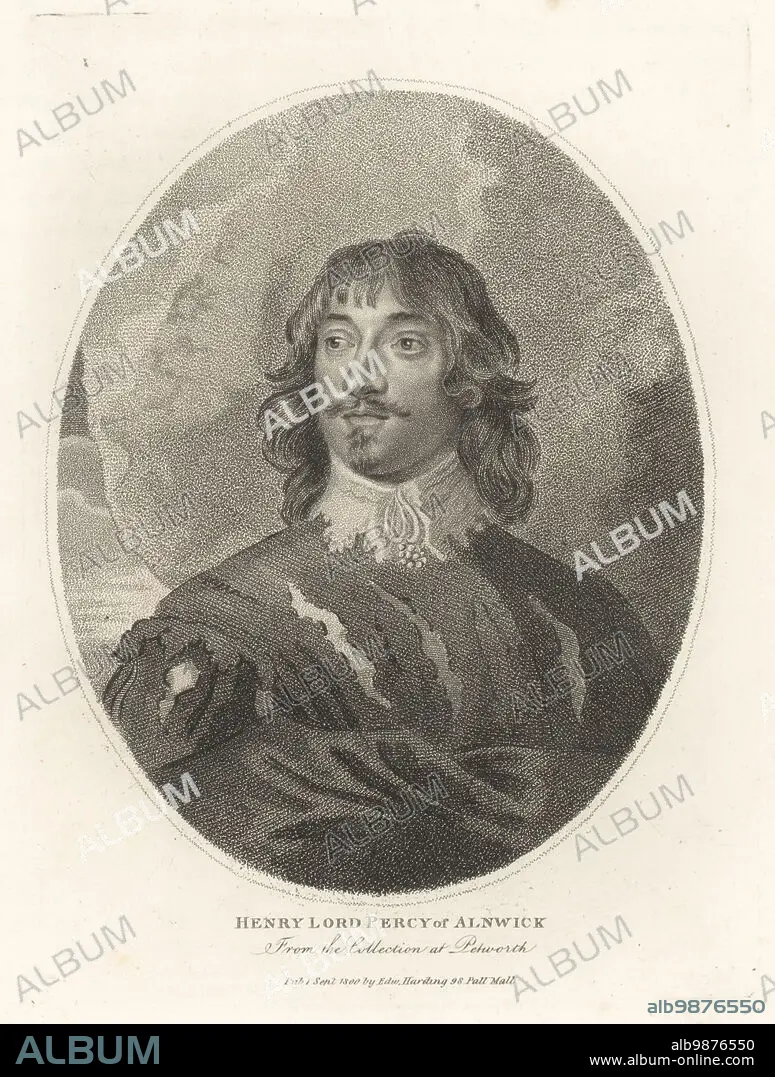 Caption: Henry Percy, Baron Percy of Alnwick, died 1659. Sat in the Short Parliament as the member for Portsmouth and in the Long Parliament as MP for Northumberland. In van Dyke beard, lace collar, doublet, with cloak. From the collection at Petworth House. Henry, Lord Percy of Alnwick. Copperplate engraving by Edward Harding from John Adolphus The British Cabinet, containing Portraits of Illustrious Personages, printed by T. Bensley for E. Harding, 98 Pall Mall, London, 1799.