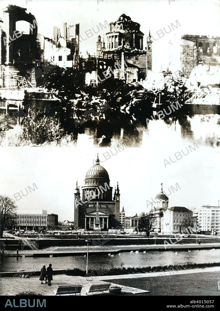 Caption: The before and after, Potsdam, Germany, World War II, c1939-c1945. The city of Potsdam was heavily damaged by Allied bombing raids. The large domed building is the Nikolaikirche (Nicholas Church).
