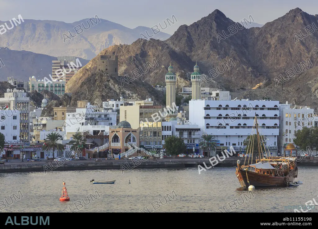 Caption: Mutrah Corniche and entrance to Mutrah Souq, backed by mountains, viewed from the sea, Muscat, Oman, Middle East
