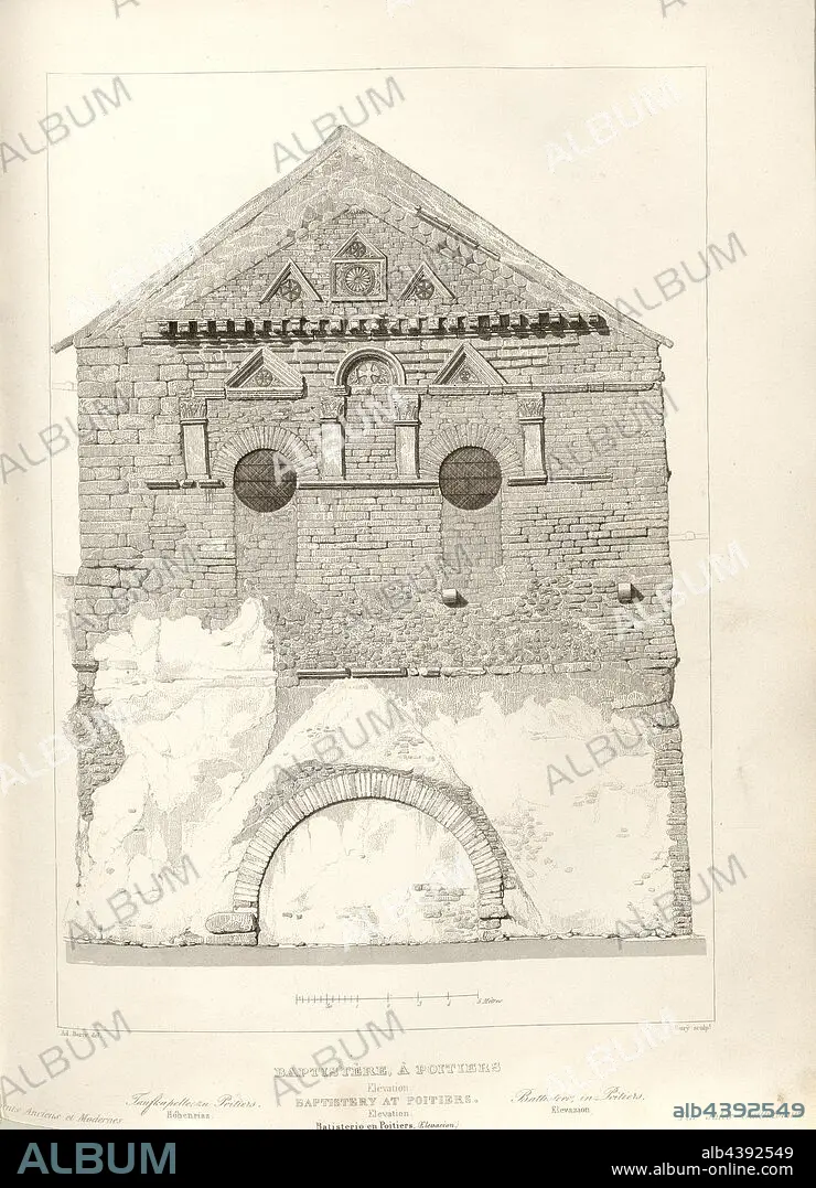 Baptistery, of Poitiers. Elevation, Baptistery St-Jean in Poitiers, signed: Ad., Berty del, Bury sculp, Fig. 25, p. 97, Berty, Adolphe (del.); Bury, Jean Baptiste Marie (sc.), 1853, Jules Gailhabaud: Monuments anciens et modernes: collection formant une histoire de l'architecture des différents peuples à toutes les époques. Paris: Librairie de Firmin Didot frères, 1853