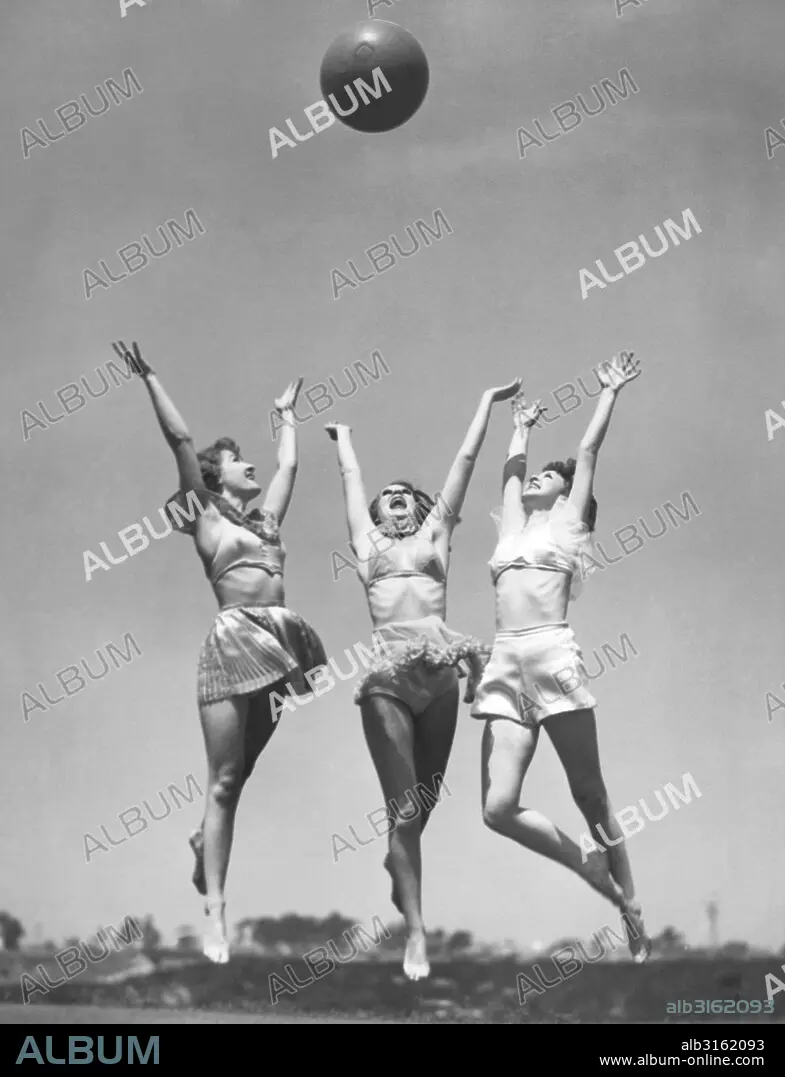 Caption: San Diego, California: August 29, 1935. Beauty contest winners at the Miss America show at the California Pacific International Exposition take time from their dancing to exercise with a medicine ball. L-R: Wilamet Matson, Miss England; Joy Williams, Miss Scotland and Pearl Alten, Miss Ireland.