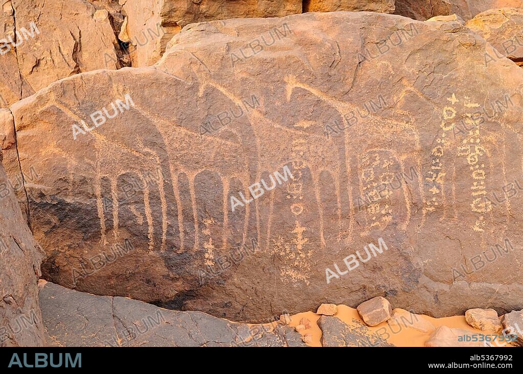 Rock engraving of a giraffe and Tifinagh writings, Adrar Tekemberet, Immidir, Algeria, Sahara, North Africa, Africa.