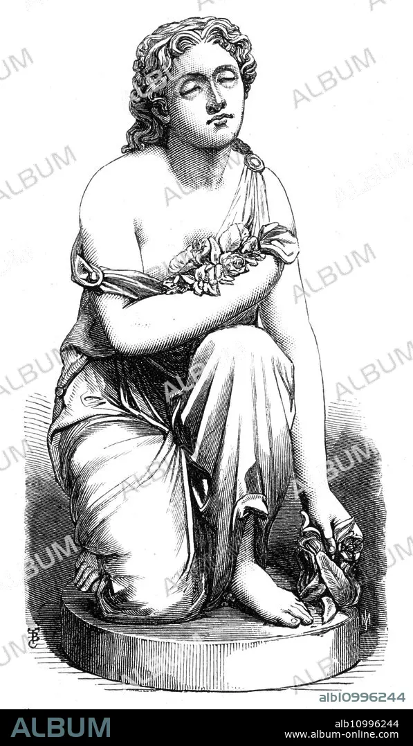 Caption: Nydia, the Blind Flower-Girl of Pompeii, gathering flowers in the garden of Glaucus, by C. F. Fuller, in the Royal Academy exhibition, 1868. Sculpture inspired by Lord Lytton's "Last Days of Pompeii". 'That portion of the narrative...seems in particular to offer a subject very susceptible of artistic treatment, and it has accordingly found a worthy illustrator in Mr. Fuller, of Florence, one of the most distinguished of our younger race of sculptors. Regarded from a technical point of view, this marble statue appears to us to indicate a marked advance in power on the part of the sculptor; the execution generally is as skilful and finished as in former works, but the carving of the flesh more happily expresses the soft rounding of the female forms in youth and health by those cushiony adipose tissues which at once nourish and beautify. The groping, apprehensive, keenly-listening habit so sadly characteristic of blindness, is also well expressed in the elevated chin, as she stoops feeling for the flowers; ah! how sweet-scented for her. There is much artistic feeling, too, although there may be less of strict physiological truth in the treatment of the eyes. Instead of the vacant stare of the born blind, they peer, as if she fain would see'. From "Illustrated London News", 1868.