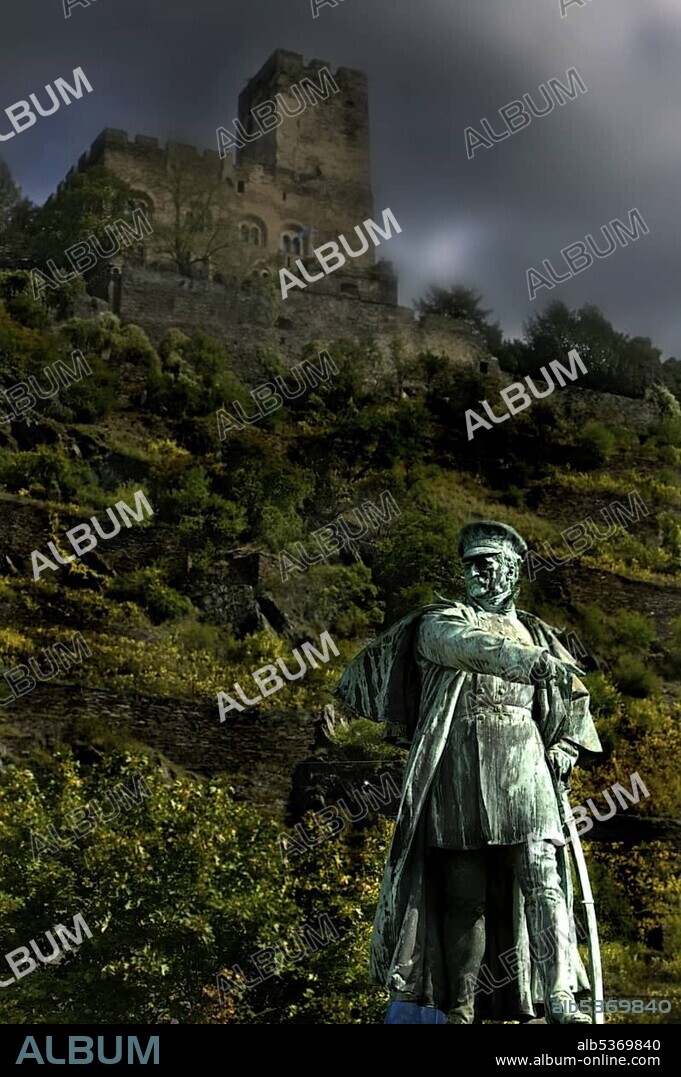 Caption: Burg Gutenfels Castle, Bluecher monument, Kaub, romantic Middle Rhine Valley, UNESCO World Heritage Site, Rhineland-Palatinate, Germany, Europe