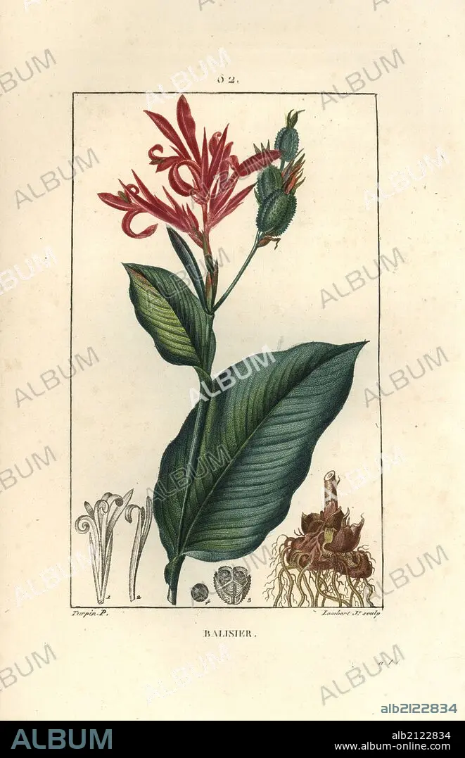 Caption: Indian cane, Canna indica. Handcoloured stipple copperplate engraving by Lambert Junior from a drawing by Pierre Jean-Francois Turpin from Chaumeton, Poiret et Chamberet's "La Flore Medicale," Paris, Panckoucke, 1830. Turpin (1775~1840) was one of the three giants of French botanical art of the era alongside Pierre Joseph Redoute and Pancrace Bessa.