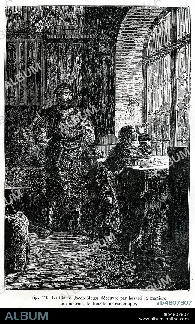 Le fils de Jacob METZU (1571-1631) decouvre par hasard la maniere de construire la lunette astronomique. Illustration de 1879 par Camille GILBERT (ne en 1838) pour Connais-toi toi-meme par Louis FIGUIER (1819-1894). Credit : Collection Jonas/Kharbine-Tapabor.