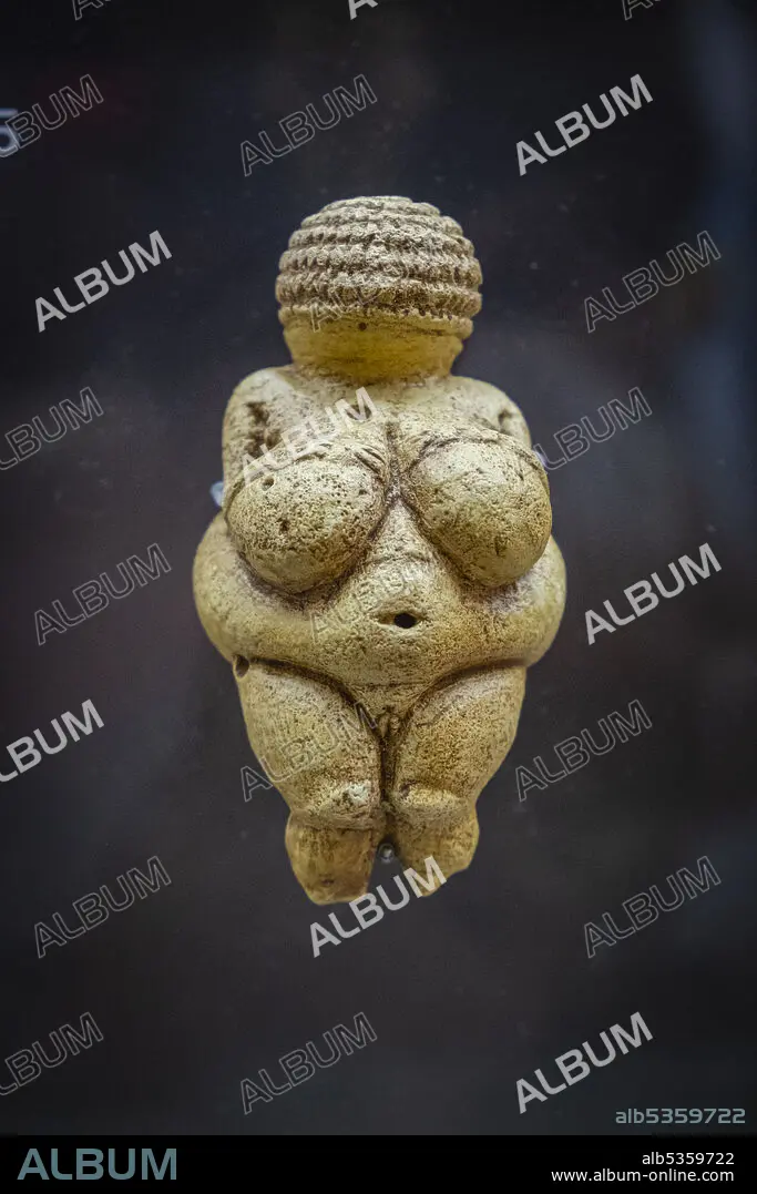 Caption: Venus of Willendorf, female limestone figurine, Gravetian Upper Paleolithic, Museo de la evolución humana, MEH, Burgos , Spain