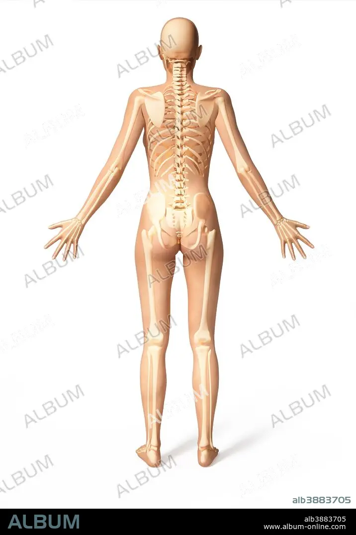 Caption: 3D rendering of a naked female standing, with skeletal bones superimposed, posterior view.