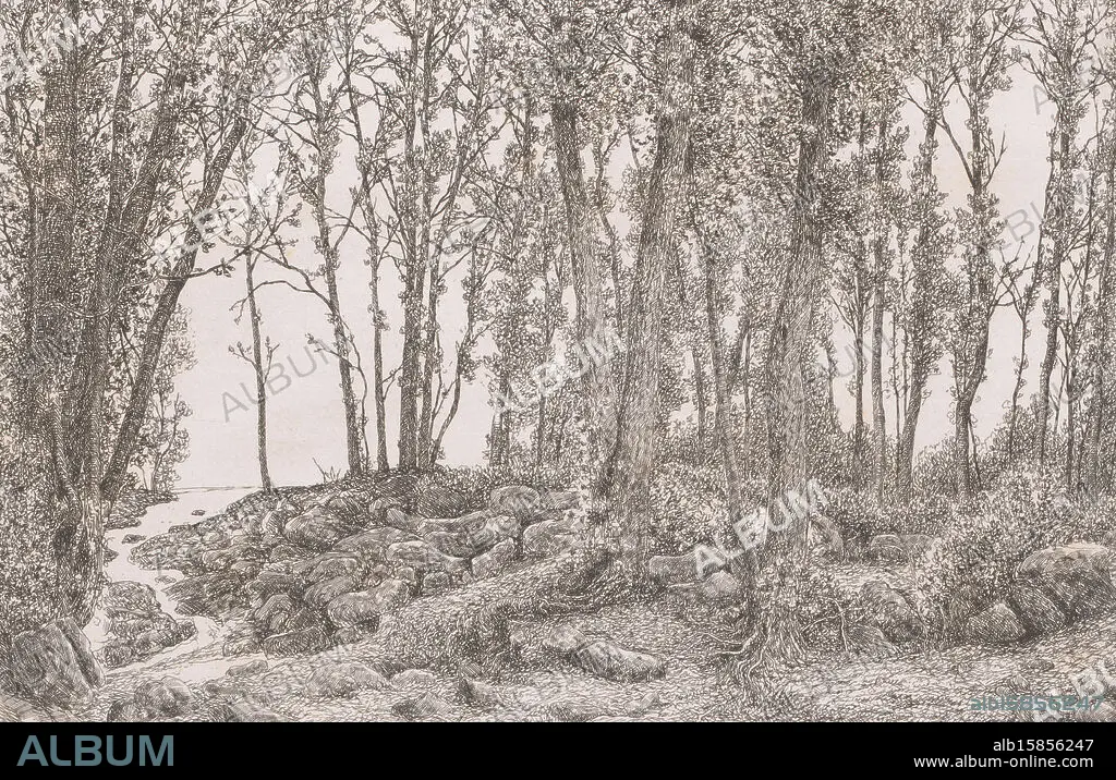Caption: Forest view with a stream on the left, print maker: Alfred Elsen, (signed by artist), 1879, paper, etching, height 185 mm × width 281 mm, print