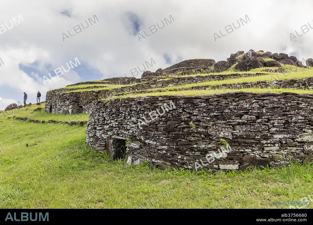 Caption: One of 53 stone masonry houses at Orongo, a stone village and Birdman ceremonial site at the southwestern tip of Easter Island, Rapa Nui National Park, UNESCO World Heritage Site, Easter Island (Isla de Pascua), Chile, South America
