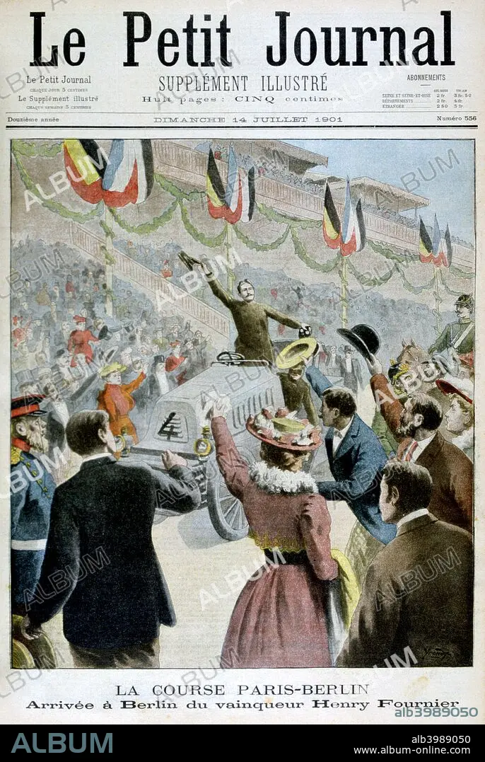 Caption: Paris Berlin Race, Arrival of the winner Henry Fournier, 1901. Illustration published in, Le Petit Journal, 14th July 1901.