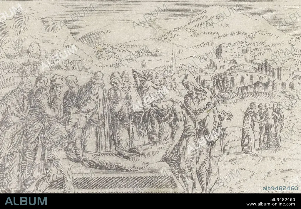 Caption: Abraham is buried by his two sons Isaac and Ishmael in his grave at Machpela where his wife Sarah is also already buried. Print from a series of 12 prints depicting the life of Abraham. All prints have four lines of German explanatory text in the lower margin, Funeral of Abraham The life of Abraham (series title), print maker: Cornelis Bos, Groningen, 1555, paper, engraving, h 70 mm × w 84 mm