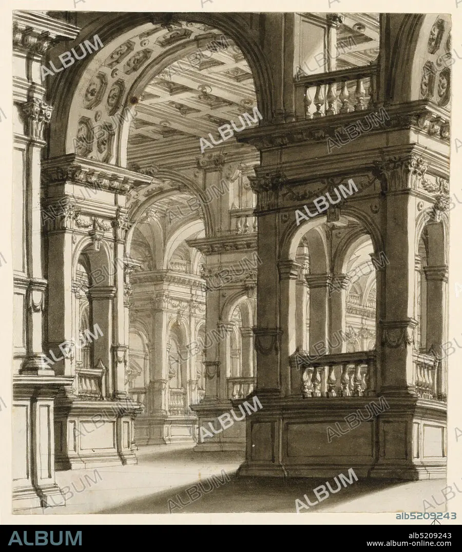 Caption: Stage Design, Interior of Renaissance Portico, Pen and bistre ink, brush and wash on paper, Vertical rectangle. Renaissance style portico with pilasters and arches, richly decorated., Italy, early 19th century, theater, Drawing, Drawing
