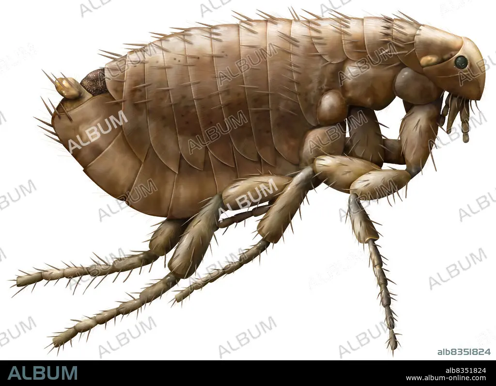Caption: Extremely small, wingless leaping insect, a parasite of certain mammals, birds and humans; it stings them to feed off their blood.