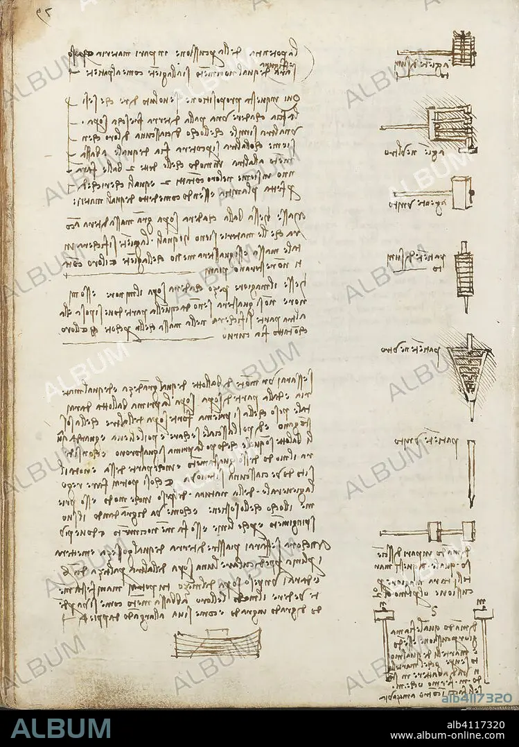 Caption: Folio f 112v. Codex Madrid I (Ms. 8937) "Treaty of statics and mechanics", 192 folios with 384 pages. Internal format: 215 x 145 mm. APPLIED MECHANICS (MACHINES AND WITS). UNITS OF WEIGHT AND MEASURES. PRINCIPLES OF MECHANICS, CINEMATICS, DYNAMICS.