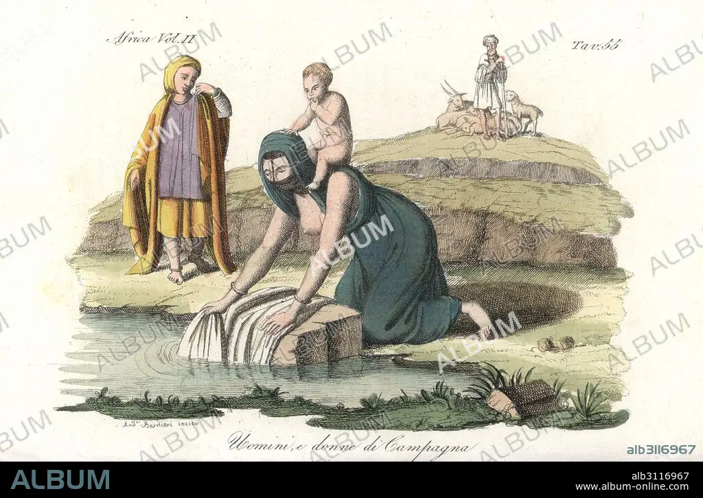 Egyptian woman in veil with bare breasts washing clothes in a river while a shepherd watches, early 19th century. Handcoloured copperplate engraving by Andrea Bernieri from Giulio Ferrario's Ancient and Modern Costumes of all the Peoples of the World, Florence, Italy, 1843.
