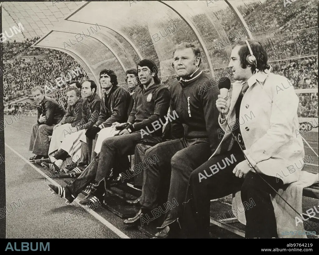Caption: Munich (Germany), 05/22/1976. Qualifying round for the 1976 Euro Cup. Second leg match played at the Olympic Stadium between the German RF and the Spanish national team, which ended with the German victory 2-0. In the image, the Spanish bench, from right to left: José María García, Kubala, Paco, Sol, Alabanda and Ángel Mur