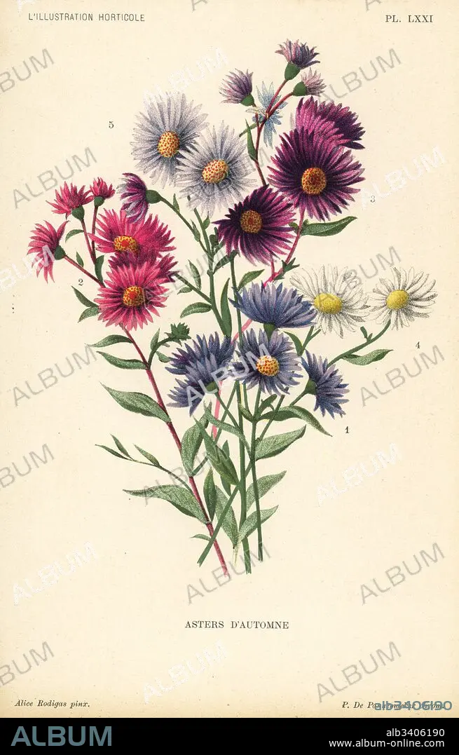 Autumnal asters: Aster novae angliae var. Constance, Aster novae angliae var. Ruber, Aster novae angliae var. Bowman, Aster amygdalinus, and Aster novi belgii Robert Parker. Chromolithograph by Pieter de Pannemaeker after an illustration by Alice Rodigas from Jean Linden's l'Illustration Horticole, Brussels, 1896.