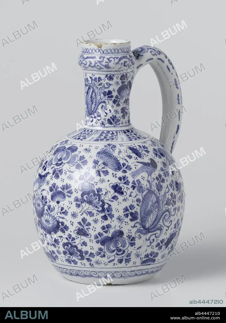 Jug Kan Jug with decor of scattered flowers, Jug of faience with sprinkle flower decor, flowers, ornament, De Drie Posteleyne Astonne, Delft, c. 1700 - c. 1720, h 22.7 cm.