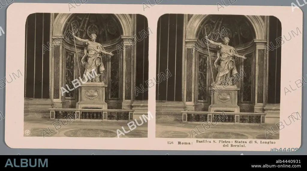 Statue of Saint Longinus in St. Peter's Basilica in Vatican City Roma: Basilica S. Pietro: Statua di S. Longino del Bernini (title on object), sculpture, interior of church, the soldier Longinus (the centurion) or Caesarea, possible attributes: lance, pyx, Neue Photographische Gesellschaft (mentioned on object), Sint-Pietersbasiliek, c. 1900 - c. 1910, cardboard, photographic paper, gelatin silver print, h 88 mm × w 179 mm