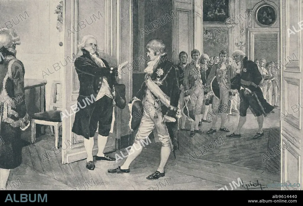 Caption: 'Charles and Ferdinand at Bayonne', 1808, (1896). Abdications of the Spanish Royal Family, Bayonne, France: King Charles IV was forced to abdicate the throne to his son Ferdinand VII in 1808 by order of the Spanish Royal Council. Engraving after the aquarelle by F De Myrbach. From Life of Napoleon Bonaparte, Volume III, by William Milligan Sloane. [The Century Co., New York, 1896]