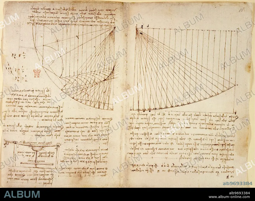 Caption: Notes and drawings by Leonardo da Vinci, early 16th century. Pages from the Notebook of Leonardo da Vinci (1452-1519), showing sketches and diagrams.