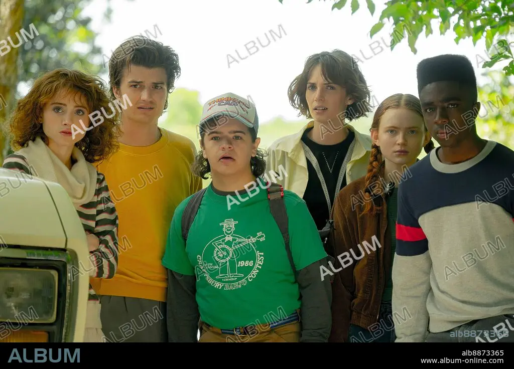 CALEB MCLAUGHLIN, GATEN MATARAZZO, JOE KEERY, MAYA HAWKE, NATALIA DYER and SADIE SINK in STRANGER THINGS, 2016, directed by MATT DUFFER and ROSS DUFFER. Copyright 21 LAPS ENT/MONKEY MASSACRE. Season 4 episode 6.