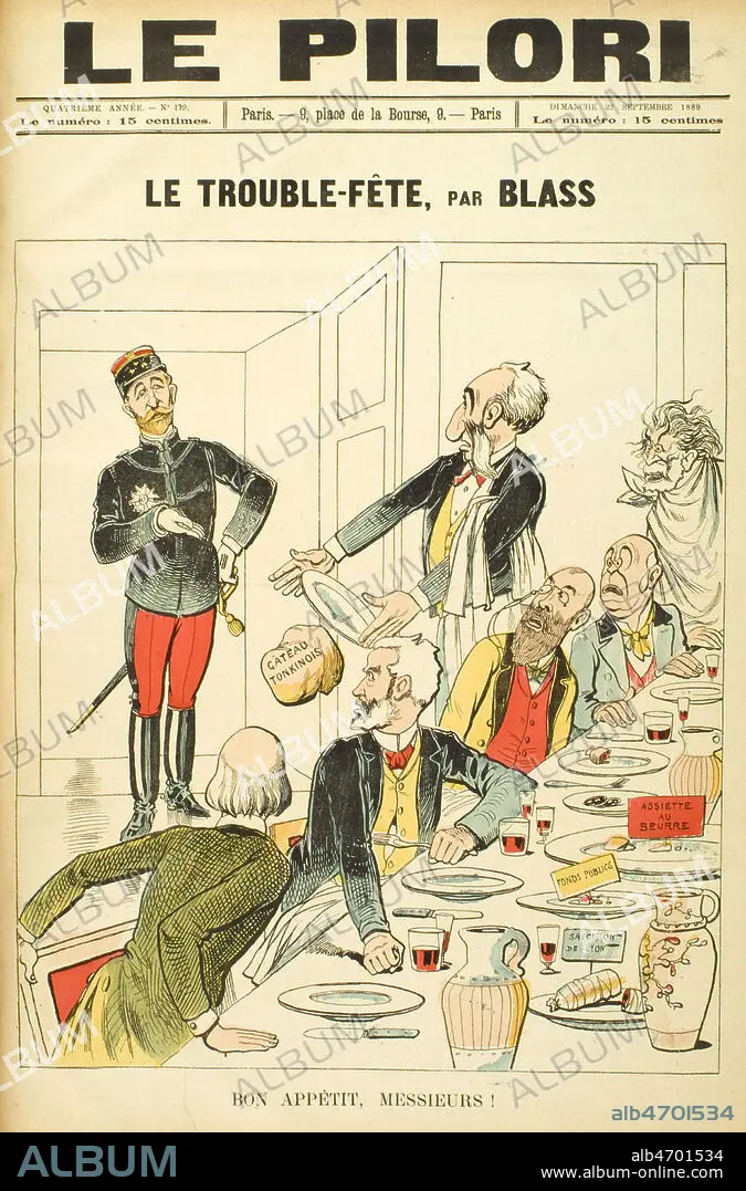 Le trouble-fete. Bon appetit messieurs. Le general BOULANGER (1837-1891) s'invitant a la table ou Jules FERRY (1832-1893) partage le gateau tonkinois. Illustration de J BLASS (1847-1892) pour Le Pilori de septembre 1889 . Credit : Coll. Dixmier/KHARBINE-TAPABOR.