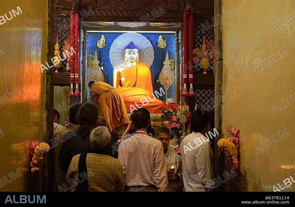 Caption: Buddhist pilgrims and visitors inside the sacred Mahabodhi Temple, with the Buddha statue next to which Siddhartha Gautama, the historic Buddha, gained awakening, Bodhi, Bodhgaya, Bihar, India, Asia