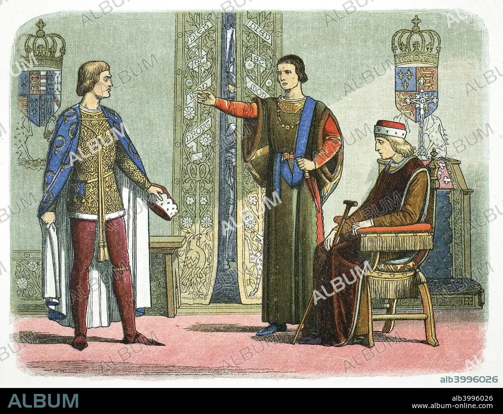 Caption: Henry VI of England and the Dukes of York and Somerset, 1450 (1864). After returning from Ireland, Richard, Duke of York (1411-1460), is surprised to find Edmund Beaufort (1406-1455), the Duke of Somerset by Henry VI's (1421-1471) side and confronts him, only to be accused by Somerset of high treason for attempting to usurp the throne.