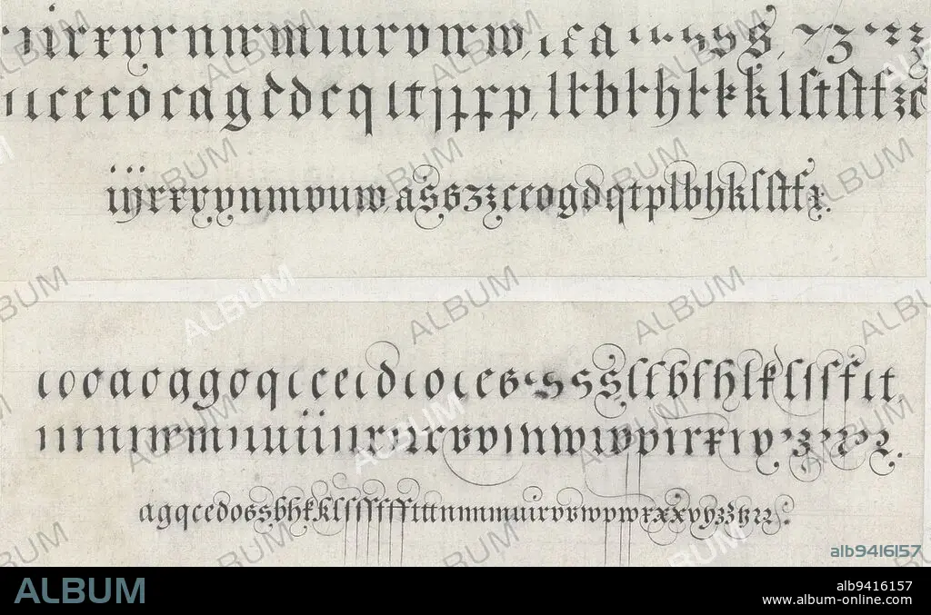 Caption: Two representations on an album leaf. These are two calligraphic drawings. Above three lines of letters in gothic textura. Below three lines of letters in fraktur. The drawings are part of an album, two designs of writing samples: textura and fraktur Spieghel der schrijfkonste (series title), Jan van de Velde (I), Rotterdam, 1605, paper, pen, h 72 mm × w 212 mm × h 66 mm × w 211 mm