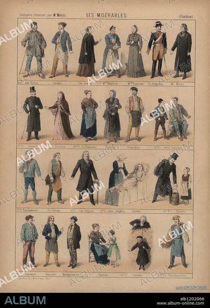 Dresses for the characters in the play "Les Miserables" by Victor Hugo. 1879 color engraving