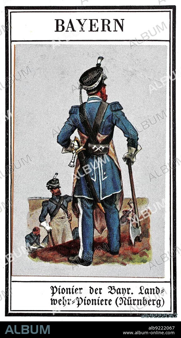 Caption: German uniforms of the 19th century, Other troops: Bavaria, Pioneer of the Bavarian Landwehr Pioneers from Nuremberg, Historical, digitally restored reproduction of a public domain collector's picture from the early 20th century