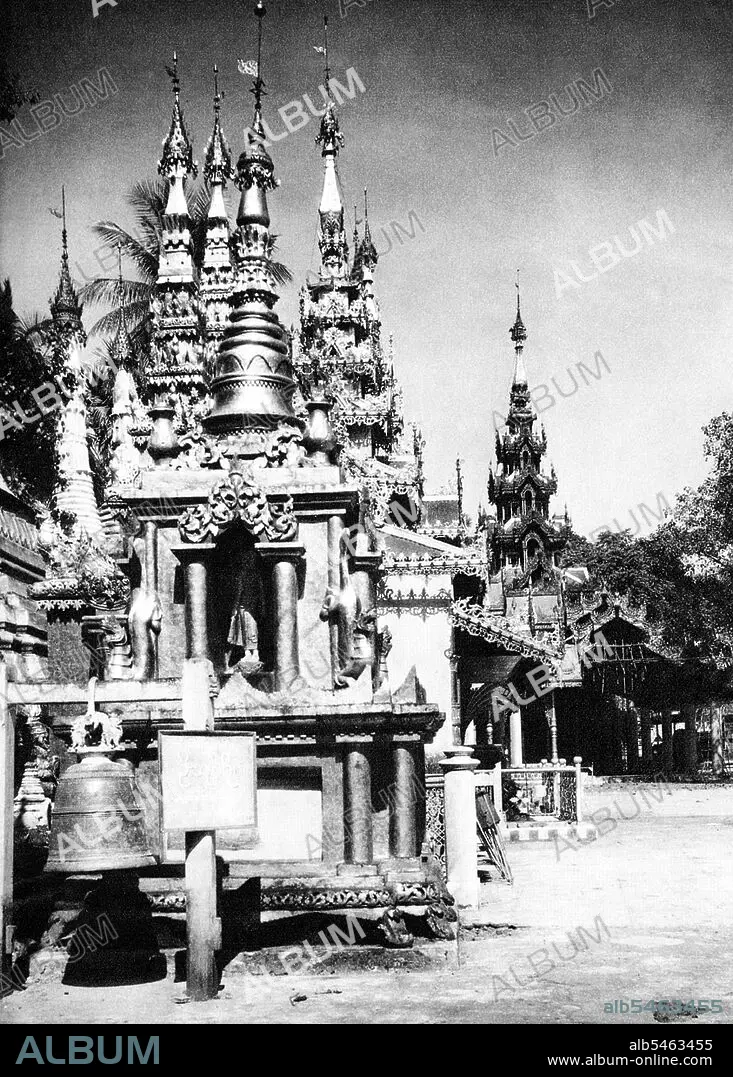 Title: Burma / Myanmar: A minor chedi and pavilion inside the compound of Shwedagon pagoda, Rangoon, c. 1920s.