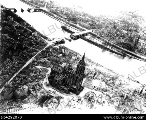 Title: Frankfurt, the cathedral area in ruins after Allied bombings