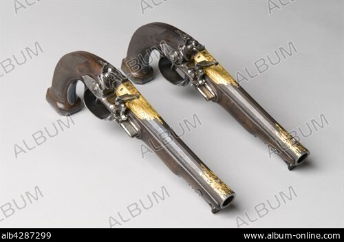 Caption: Pair of flintlock pistols from an officer. 15 mm, length: 315 mm. French First Empire. Private collection. Cannons decorated with gold. Trimmings in engraved steel. Decorations: urn with flowers, spider webs, leaves patterns. Octagonal part of the grip engraved with flowers and friezes. Walnut wood butts