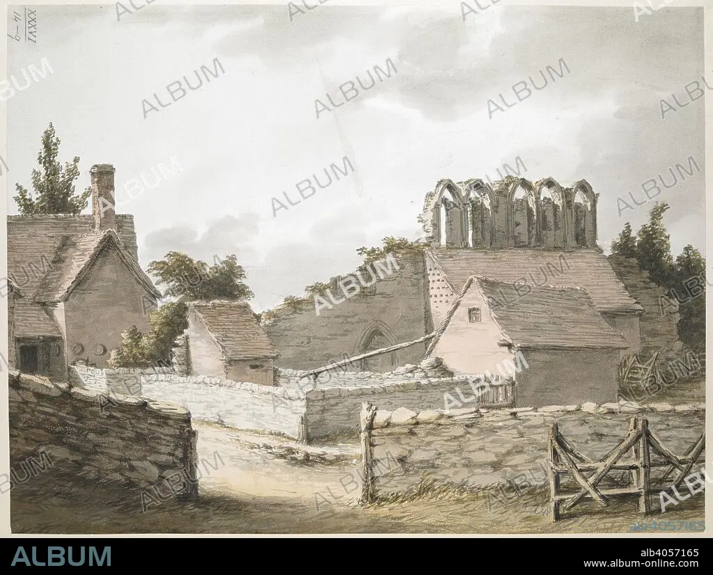 Caption: A watercolour view of the ruins of Manor Abbey, Halesowen. A stone wall in the foreground; farm buildings and a house in the middle ground; the abbey ruins and trees in the distance . West view of the ruins of the Manor Abbey, Halesowen. c. 1780. Pen and black ink with watercolour. Source: Maps K.Top.36.14.g.