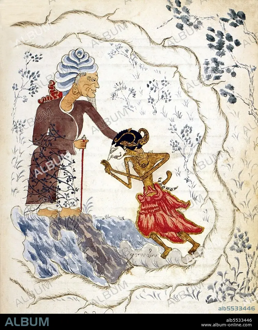 Title: Indonesia: Prince Selarasa kneels before a holy man. Illustration in wayang (shadow puppet) style from the 'Serat Selarasa', Java,1804.