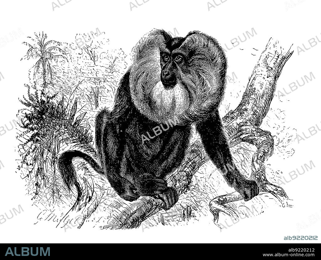 Caption: Lion-tailed macaque (Macaca silenus) or wanderu, a primate species from the macaque genus within the guenon family, digitally restored reproduction of a 19th century original, exact original date not known