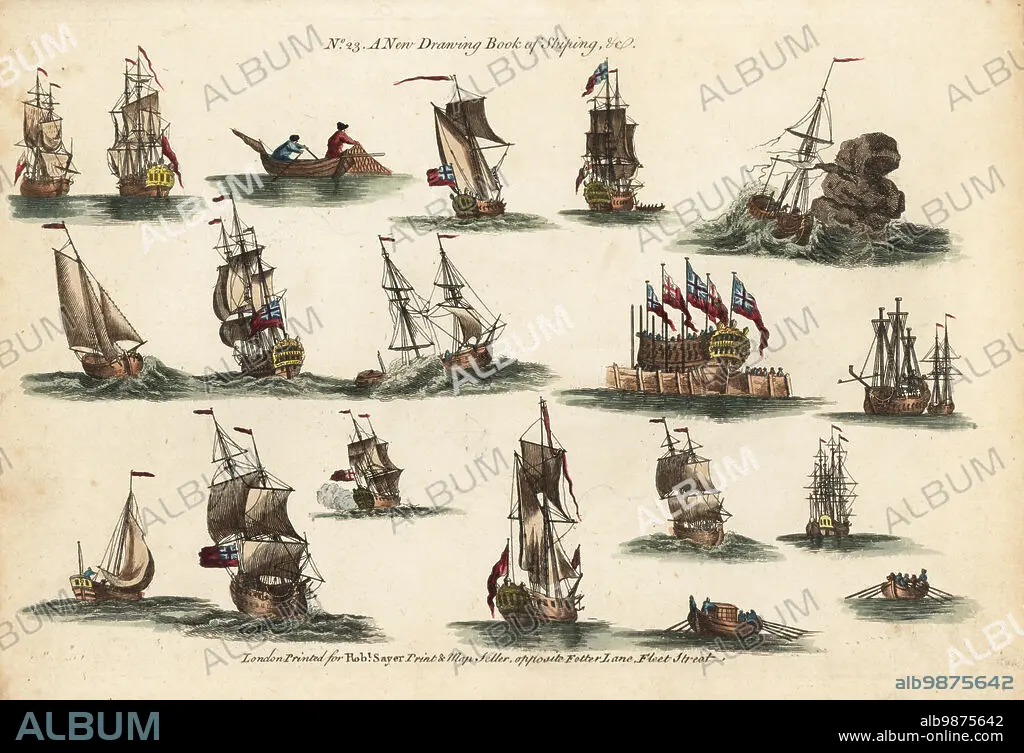 Caption: 18th century nautical scenes with tall ships, frigates, sailing boats, fishermen with nets, sloops, hulks, etc. No. 23 A New Drawing Book of Shiping etc. Handcoloured copperplate engraving from Robert Sayers The Artists Vade Mecum, Being the Whole Art of Drawing, London, 1766.