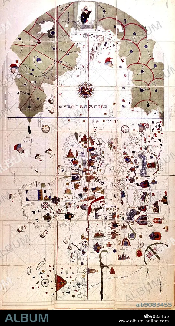 Caption: The earliest map showing both Old and New Worlds, drawn in 1500 by Juan de la Cosa, who sailed with Columbus on the second voyage. Unknown lands are coloured the traditional green.