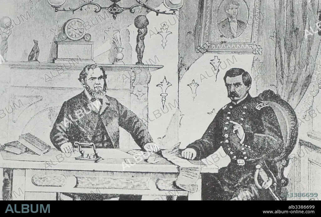 Caption: Portrait of Allan Pinkerton (1819-1884) a Scottish American detective, spy and creator of the Pinkerton National Detective Agency and George B. McClellan (1826-1885) an American soldier, civil engineer, railroad executive, and politician. Dated 19th Century.