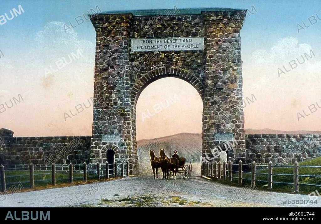 Caption: Postcard of the Roosevelt Arch at the north entrance photographed by Frank J. Haynes, no date. The Roosevelt Arch is a rusticated triumphal arch at the north entrance to Yellowstone National Park in Gardiner, Montana. Constructed under the supervision of the U.S. Army at Fort Yellowstone, its cornerstone was laid down by President of the United States Theodore Roosevelt in 1903. The top of the arch is inscribed with a quote from the Organic Act of 1872, the legislation which created Yellowstone, which reads "For the Benefit and Enjoyment of the People." Yellowstone National Park is a national park located primarily in the state of Wyoming, although it also extends into Montana and Idaho. It was established by the U.S. Congress and signed into law by President Ulysses S. Grant on March 1, 1872.