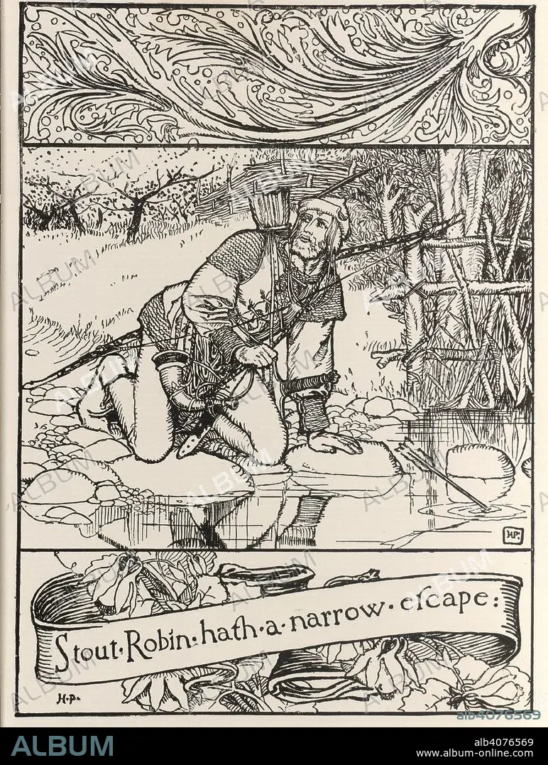 HOWARD PYLE. Stout Robin hath a narrow escape. Robin Hood in danger. The Merry Adventures of Robin Hood ... Illustrated. Sampson Low & Co.: London, 1883. Source: 558*.b.31, opposite 243. Language: English.