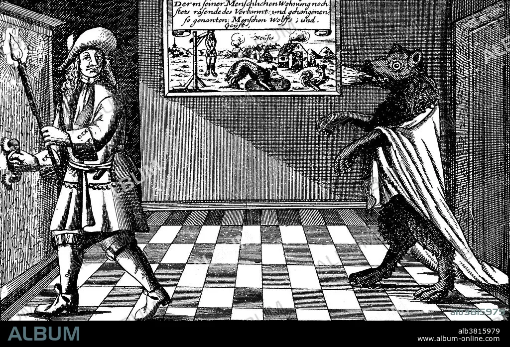 Caption: In 1685 the Bavarian town of Ansbach was being terrorized by a large vicious wolf. The rumors were that the wolf was actually a werewolf whose identity was that of the town's dead mayor. When the wolf was killed, the people of Ansbach dressed the wolf's carcass to resemble their mayor. It was then put on display in the town square and later moved to a museum. A werewolf, in European folklore, is a man who turns into a wolf at night and devours animals, people, or corpses but returns to human form by day. Some werewolves change shape at will; others, in whom the condition is hereditary or acquired by having been bitten by a werewolf, change shape involuntarily, under the influence of a full moon. If he is wounded in wolf form, the wounds will show in his human form and may lead to his detection. Belief in werewolves is found throughout the world. The psychiatric condition in which a person believes he is a wolf is called lycanthropy. In French folklore, the werewolf is called loup-garou. France was particularly afflicted with reports of them in the 16th century, and there were many notable convictions and executions of loups-garous.