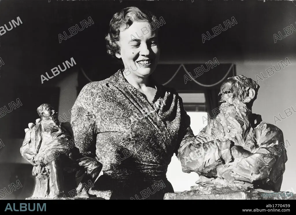 Tatiana Tolstoj Albertini, granddaughter of Russian writer Lev Tolstoj, showing two sculptures portraying her grandfather. Italy, 1950s